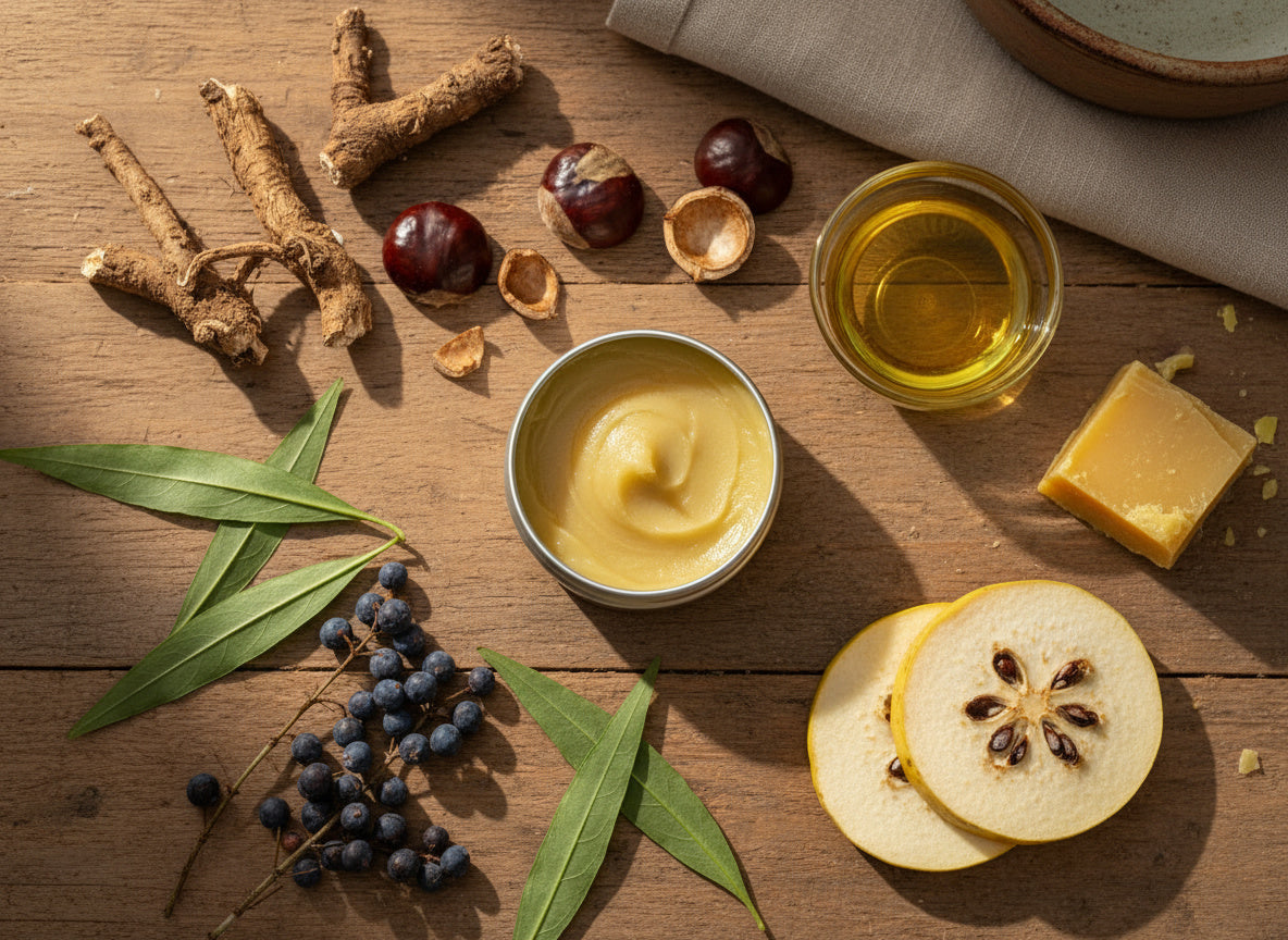Конският кестен (есцин) и етеричните масла от лимон и кипарис укрепват стените на кръвоносните съдове, намаляват пропускливостта им и подпомагат лимфния дренаж.