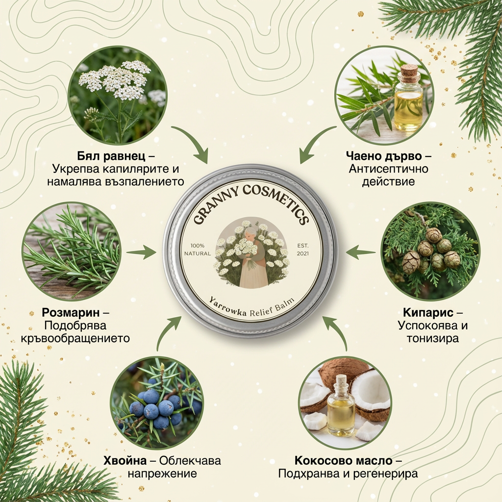 Нашият мехлем комбинира черен оман, конски кестен, живовляк и хвойна – билки, познати от поколението на българите със своето дълбоко възстановяващо и противовъзпалително действие. Без химикали, без пълнители – само чиста, активна природа в бурканче.